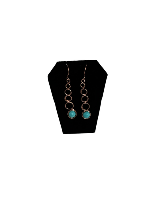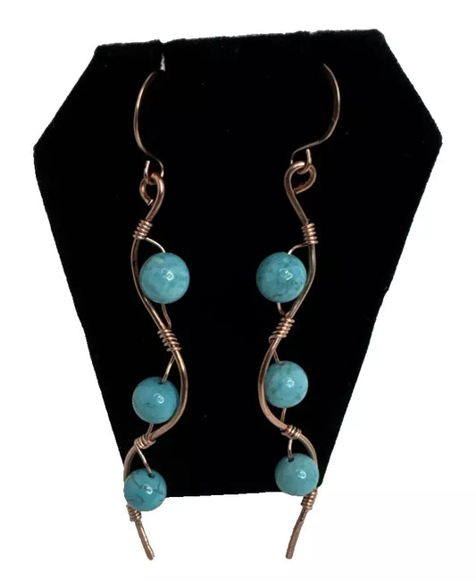 Copper Wave Dangle Earrings With Turquoise Beads And French Hook